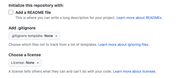 然后,在 GitHub.com 上创建一个新的仓库。不要初始化新的仓库(不要添加 README、许可证或 gitignore 文件)。